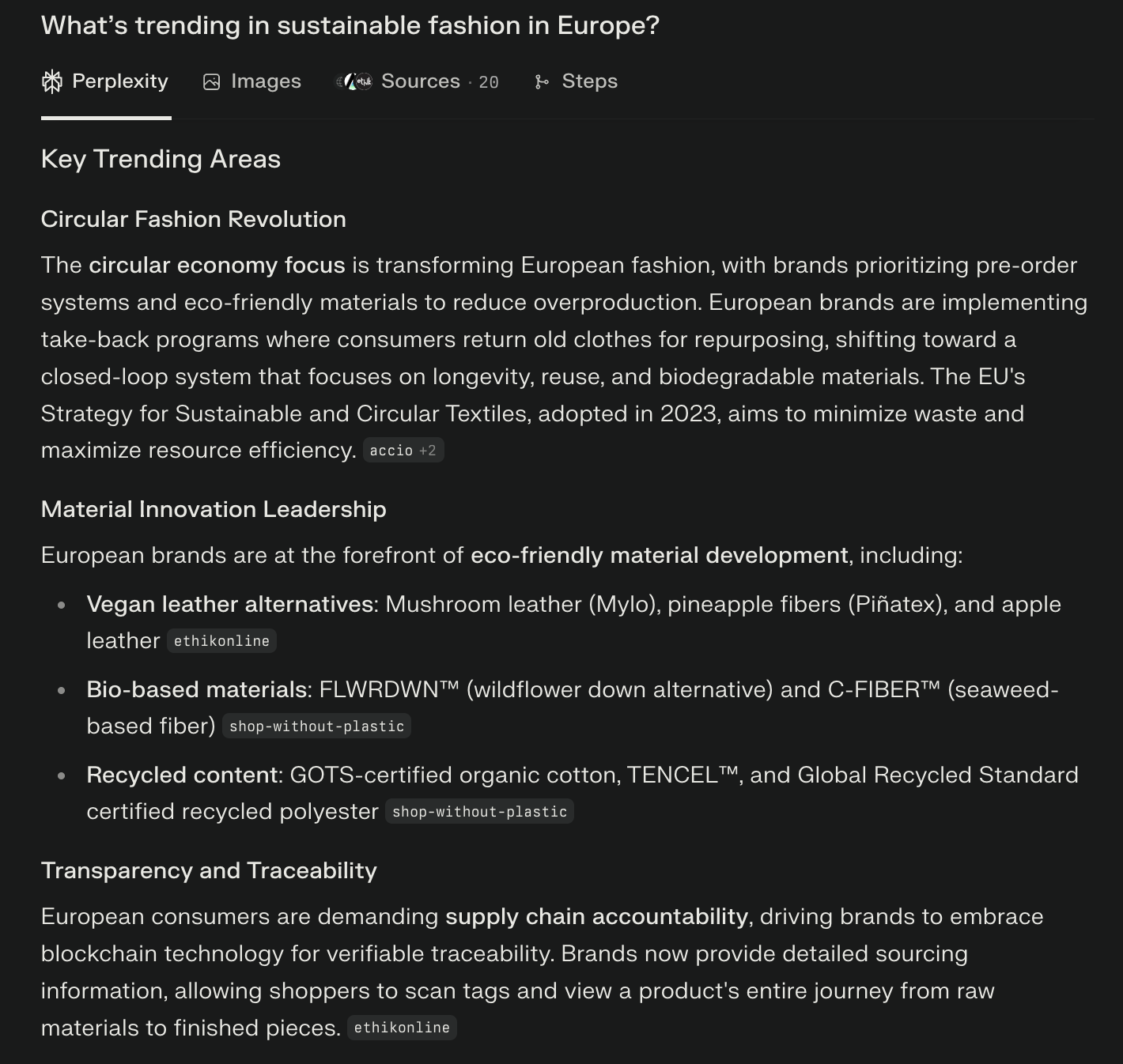 As your intelligent research partner, you can ask Perplexity one question, say - “What’s trending in sustainable fashion in Europe?” and get a clear, consolidated answer in seconds instead of wading through endless reports yourself. So, you spend less time searching and more time acting on insights while they still matter.