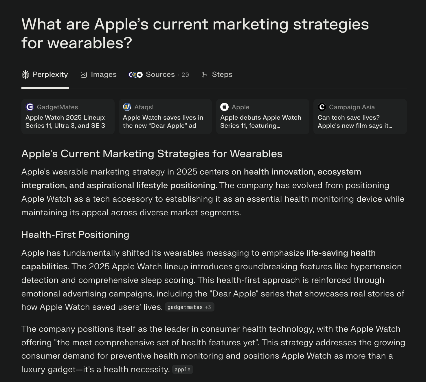 Perplexity also takes the pain out of competitor tracking. A D2C electronics brand, for instance, could simply ask, “What are Apple’s current marketing strategies for wearables?” and get structured insights back in minutes. That kind of intel makes it easier to fine-tune your positioning and stay one step ahead.