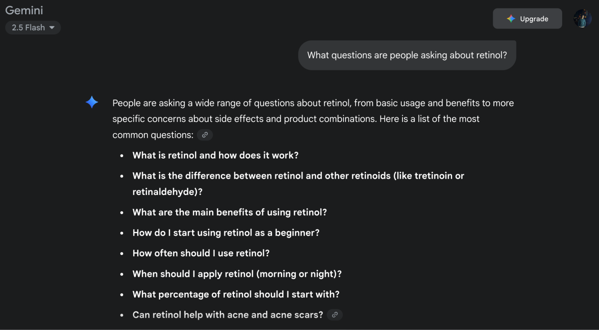 For example, a skincare brand could ask, “What questions are people asking about retinol?” and instantly get a list of ideas they can turn into blog posts or product copy. So that’s less brainstorming time for you and more time publishing content that drives traffic.