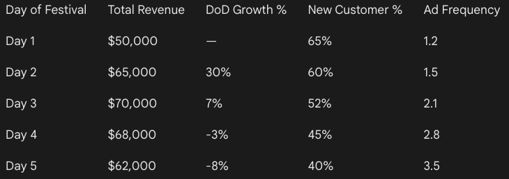 Analyze day-over-day momentum throughout the festival window and identify the point where demand showed signs of fatigue or saturation. Indicate whether the slowdown was structural or campaign-driven.