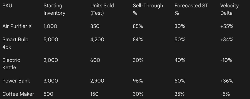Compare sell-through velocity before and during the festival to identify products that outpaced replenishment assumptions.