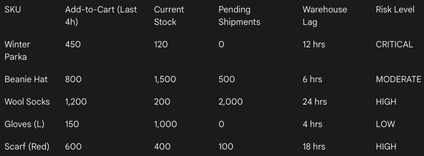 Detect early signals of impending stock stress, such as rising add-to-cart rates combined with slowing fulfillment or shrinking available inventory.