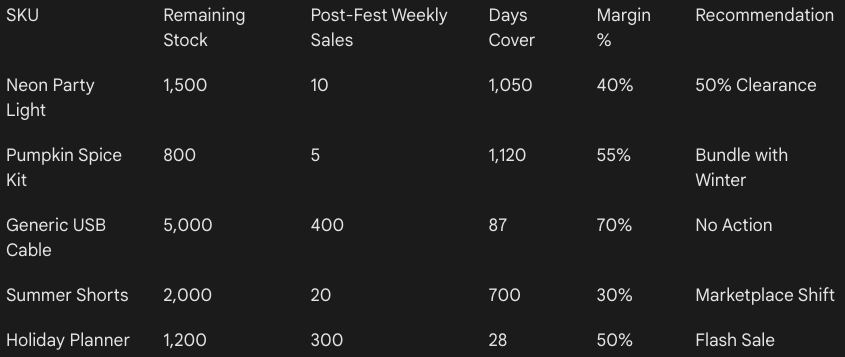 Identify products with elevated inventory risk after the festival ends and recommend corrective actions such as markdowns, channel shifts, or bundle strategies.
